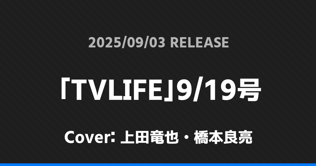 「TVLIFE」9/19号表紙は上田竜也・橋本良亮! A.B.C-Z 2026.01.24 ※本ページにはプロモーションが含まれています。 商品リンク Amazon 楽天ブックス セブンネット タワーレコード 詳細情報 発売日:2025/09/03 表紙:上田竜也・橋本良亮 「TVLIFE」9/19号の表紙は上田竜也・橋本良亮さんです! 「TVガイドPERSON」vol.157表紙は上田竜也・橋本良亮! 「ミュージカル」9月・10月号表紙は京本大我! ホームA.B.C-Z