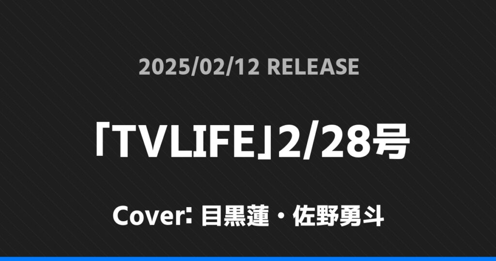「TVLIFE」2/28号表紙は目黒蓮・佐野勇斗! Snow Man 2026.01.24 ※本ページにはプロモーションが含まれています。 商品リンク Amazon 楽天ブックス セブンネット タワーレコード 詳細情報 発売日:2025/02/12 表紙:目黒蓮・佐野勇斗 「TVLIFE」2/28号の表紙は目黒蓮・佐野勇斗さんです! 「別冊+act.」vol.39表紙は松村北斗・松たか子! 「up PLUS MARCH 2025」表紙は嶋崎斗亜・岡崎彪太郎・當間琉巧! ホームSnow Man