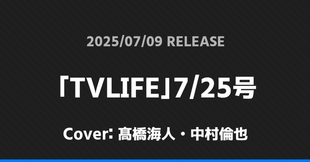 「TVLIFE」7/25号表紙は髙橋海人・中村倫也! King & Prince 2026.01.24 ※本ページにはプロモーションが含まれています。 商品リンク Amazon 楽天ブックス セブンネット タワーレコード 詳細情報 発売日:2025/07/09 表紙:髙橋海人・中村倫也 「TVLIFE」7/25号の表紙は髙橋海人・中村倫也さんです! 「FINEBOYS」8月号表紙は渡辺翔太! 「anan」No.2454表紙は向井康二・マーチ=チュターウット・パッタラガムポン! ホームKing & Prince