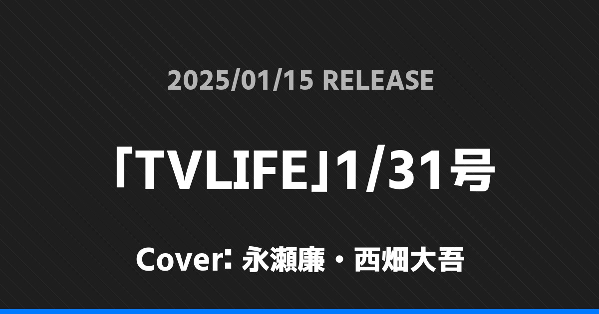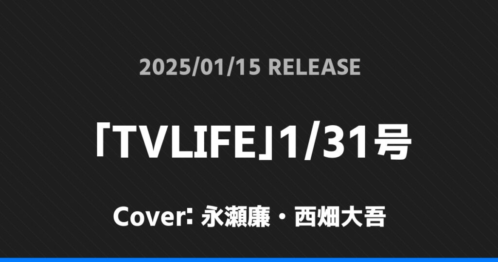 「TVLIFE」1/31号表紙は永瀬廉・西畑大吾! King & Prince 2026.01.24 ※本ページにはプロモーションが含まれています。 商品リンク Amazon 楽天ブックス セブンネット タワーレコード 詳細情報 発売日:2025/01/15 表紙:永瀬廉・西畑大吾 「TVLIFE」1/31号の表紙は永瀬廉・西畑大吾さんです! 「QLAP!」2月号表紙はAぇ! group! 「TVfan CROSS」Vol.48表紙は丸山隆平! ホームKing & Prince