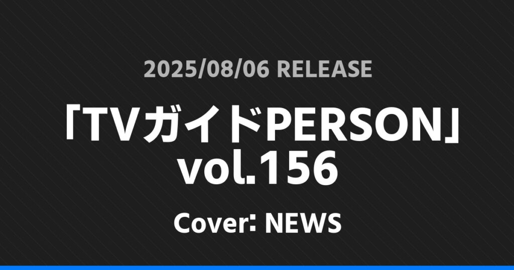 「TVガイドPERSON」vol.156表紙はNEWS! NEWS 2026.01.24 ※本ページにはプロモーションが含まれています。 商品リンク Amazon 楽天ブックス セブンネット タワーレコード 詳細情報 発売日:2025/08/06 表紙:NEWS 「TVガイドPERSON」vol.156の表紙はNEWSさんです! 「anan」No.2458表紙は深澤辰哉! 「TVLIFE」8/22号表紙はNEWS! ホームNEWS