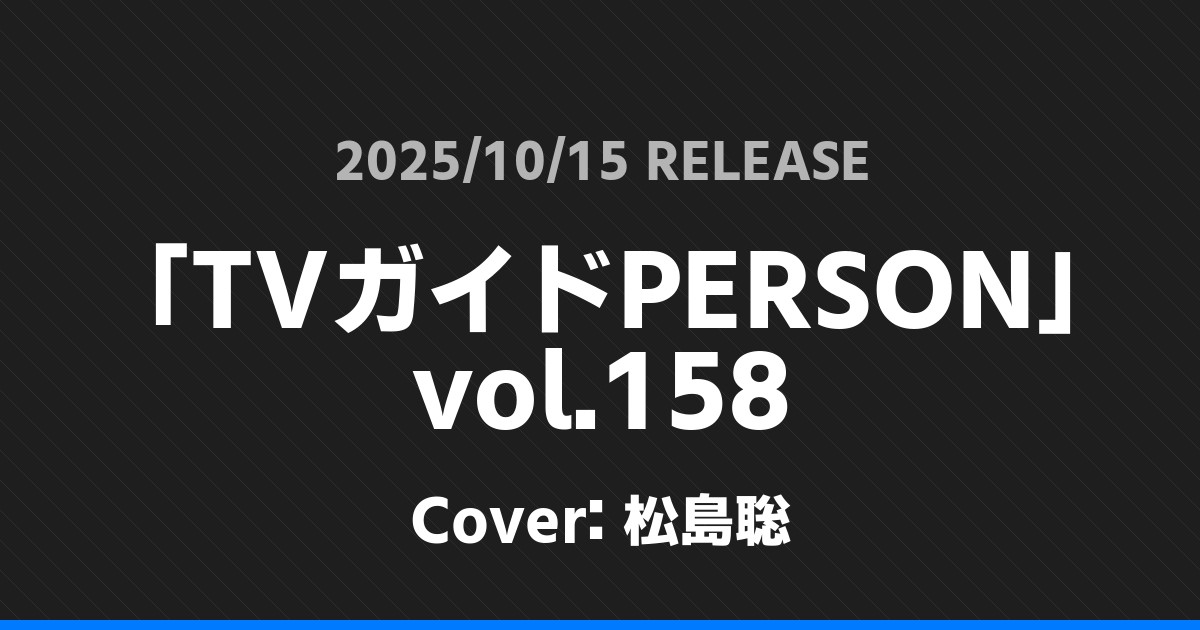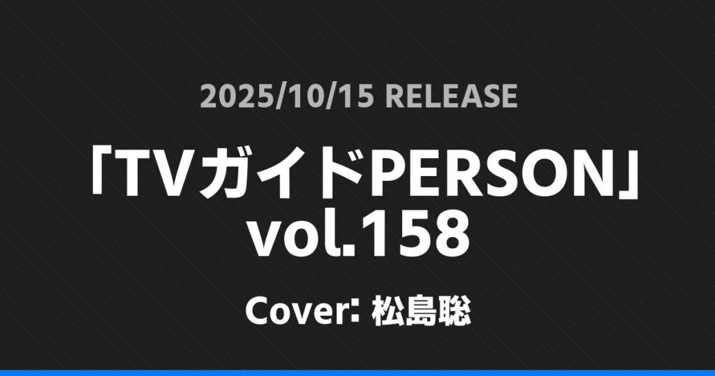 「TVガイドPERSON」vol.158表紙は松島聡! timelesz 2026.01.24 ※本ページにはプロモーションが含まれています。 商品リンク Amazon 楽天ブックス セブンネット タワーレコード 詳細情報 発売日:2025/10/15 表紙:松島聡 「TVガイドPERSON」vol.158の表紙は松島聡さんです! 「週刊TVガイド」10/24号表紙はKis-My-Ft2! 「TVLIFE」10/31号表紙は橋本将生! ホームtimelesz