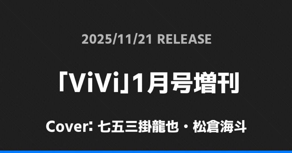 「ViVi」1月号増刊表紙は七五三掛龍也・松倉海斗! Travis Japan 2026.01.24 ※本ページにはプロモーションが含まれています。 商品リンク Amazon 楽天ブックス セブンネット タワーレコード 詳細情報 発売日:2025/11/21 表紙:七五三掛龍也・松倉海斗 「ViVi」1月号増刊の表紙は七五三掛龍也・松倉海斗さんです! 「TVfan」1月号表紙は岩本照・藤原丈一郎! 「SODA」1月号表紙は高橋恭平・木村柾哉・中島颯太! ホームTravis Japan