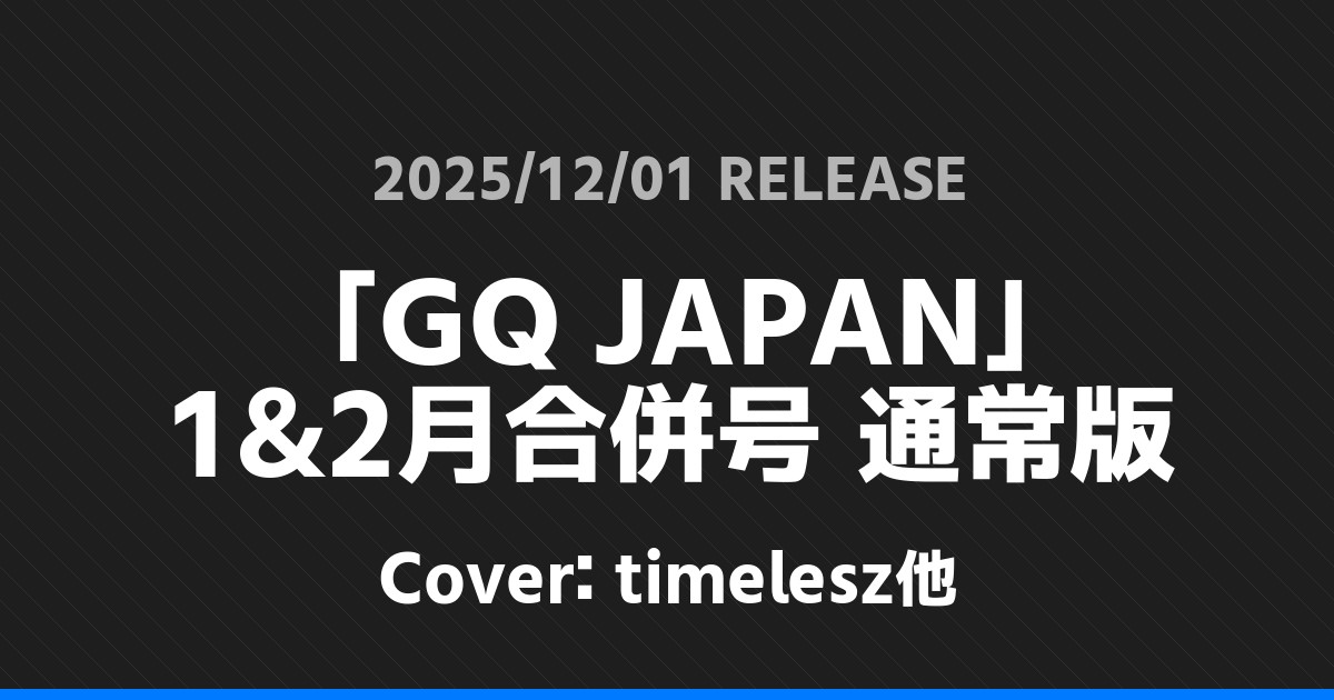 「GQ JAPAN」1&2月合併号 通常版表紙はtimelesz他! timelesz 2026.01.24 ※本ページにはプロモーションが含まれています。 商品リンク Amazon 楽天ブックス セブンネット タワーレコード 詳細情報 発売日:2025/12/01 表紙:timelesz他 「GQ JAPAN」1&2月合併号 通常版の表紙はtimelesz他さんです! 「GQ JAPAN」1月号増刊 特別表紙版表紙はtimelesz! 「CHEER」Vol.64表紙は高橋恭平・木村柾哉・中島颯太! ホームtimelesz
