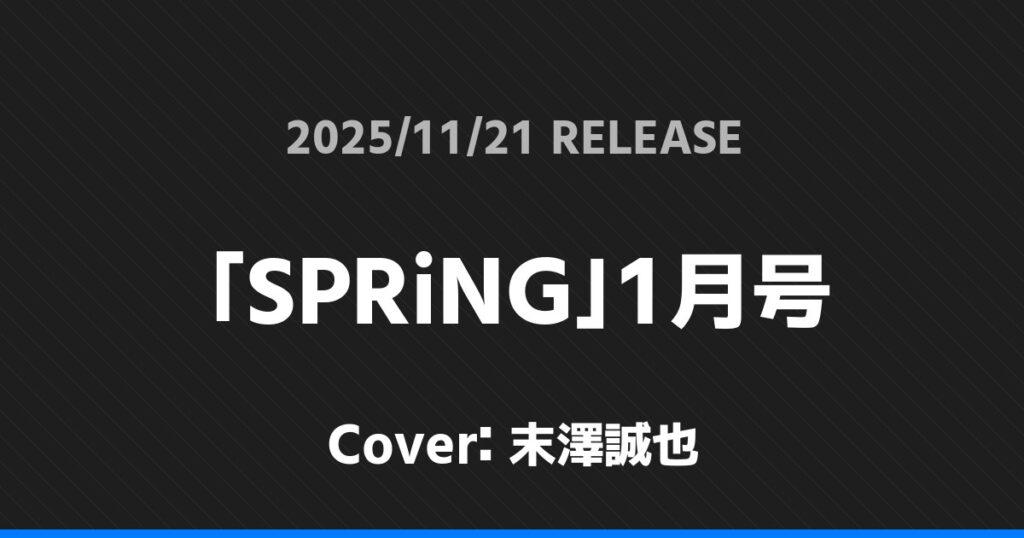 「SPRiNG」1月号表紙は末澤誠也! Aぇ! group 2026.01.24 ※本ページにはプロモーションが含まれています。 商品リンク Amazon 楽天ブックス セブンネット タワーレコード 詳細情報 発売日:2025/11/21 表紙:末澤誠也 「SPRiNG」1月号の表紙は末澤誠也さんです! 「BARFOUT!」12月号表紙は寺西拓人! 「日経エンタテインメント! 」1月号表紙は橋本将生・猪俣周杜・篠塚大輝! ホームAぇ! group