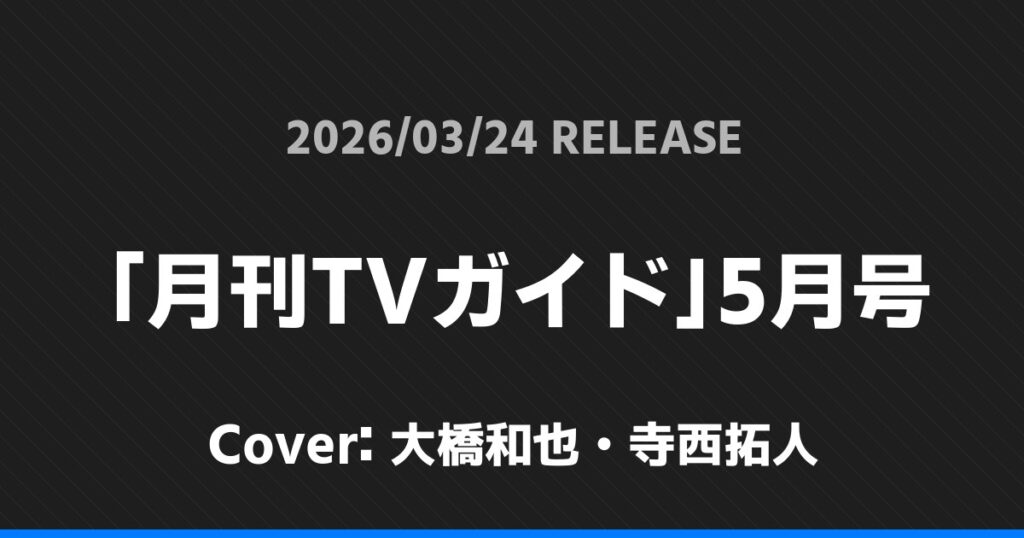 「月刊TVガイド」5月号表紙は大橋和也・寺西拓人! timelesz 2026.03.092026.03.24 ※本ページにはプロモーションが含まれています。 商品リンク Amazon 楽天ブックス セブンネット タワーレコード 詳細情報 発売日:2026/03/24 表紙:大橋和也・寺西拓人 「月刊TVガイド」5月号の表紙は大橋和也・寺西拓人さんです! https://twitter.com/GEKKAN_TVGUIDE/status/2030842498508276031?s=20 スポンサーリンク 「anan」No.2488表紙は永瀬廉! 「MEN’S NON-NO」5月号表紙は道枝駿佑! ホームtimelesz
