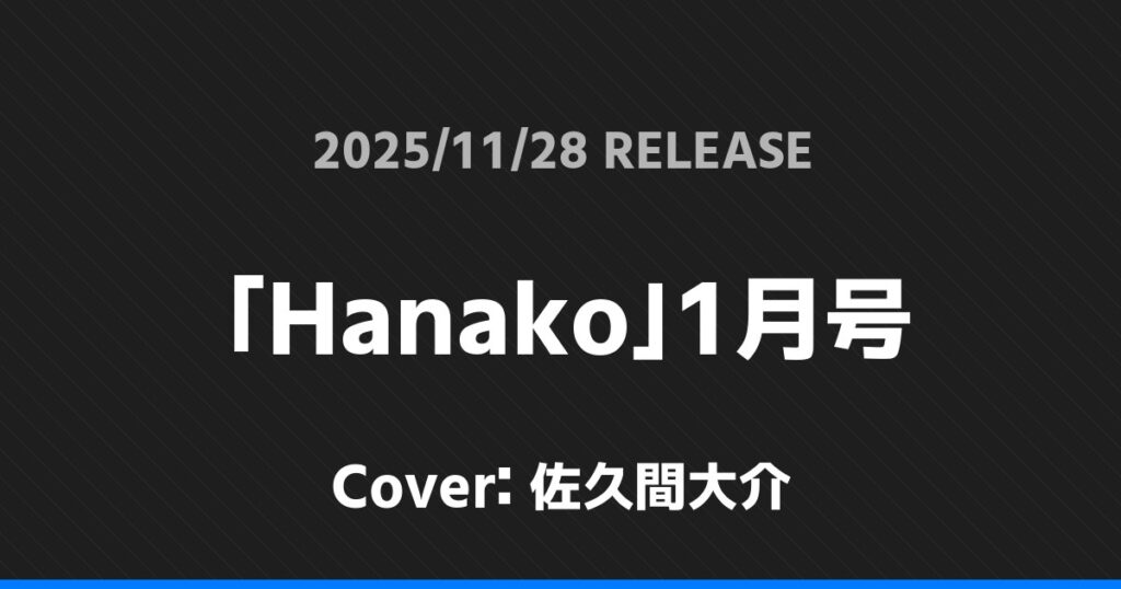 「Hanako」1月号表紙は佐久間大介! Snow Man 2026.01.24 ※本ページにはプロモーションが含まれています。 商品リンク Amazon 楽天ブックス セブンネット タワーレコード 詳細情報 発売日:2025/11/28 表紙:佐久間大介 「Hanako」1月号の表紙は佐久間大介さんです! 「キネマ旬報NEXT」vol.68表紙は佐久間大介・渋谷龍太! 「ELLE JAPON」1月号特別版表紙は渡辺翔太! ホームSnow Man