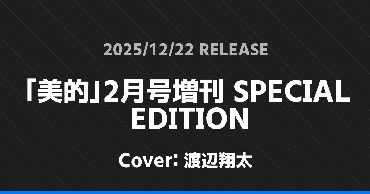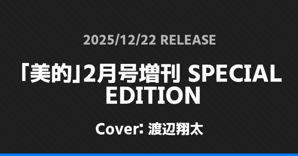 「美的」2月号増刊 SPECIAL EDITION表紙は渡辺翔太! Snow Man 2026.01.24 ※本ページにはプロモーションが含まれています。 商品リンク Amazon 楽天ブックス セブンネット タワーレコード 詳細情報 発売日:2025/12/22 表紙:渡辺翔太 「美的」2月号増刊 SPECIAL EDITIONの表紙は渡辺翔太さんです! 「ViVi」2・3月合併号特別版表紙はAぇ! group! 「ペットポップスクエア」Vol.14表紙は浮所飛貴! ホームSnow Man
