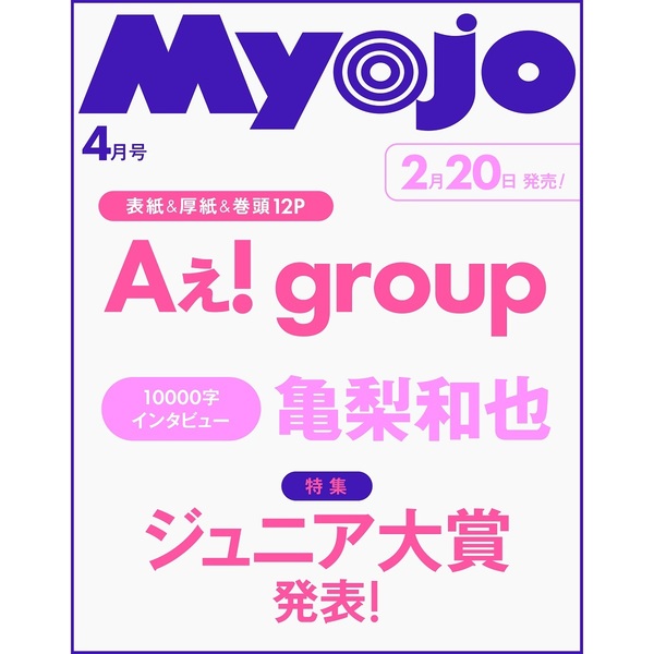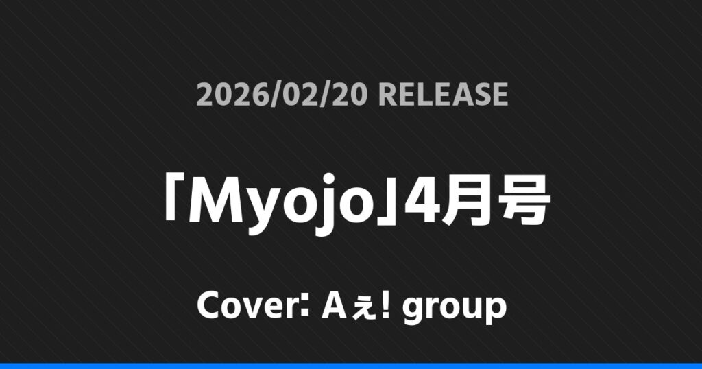 「Myojo」4月号表紙はAぇ! group! Aぇ! group 2026.01.222026.02.06 ※本ページにはプロモーションが含まれています。 商品リンク Amazon 楽天ブックス セブンネット タワーレコード 詳細情報 発売日:2026/02/20 表紙:Aぇ! group 「Myojo」4月号の表紙はAぇ! groupさんです! 「FREECELL」vol.72表紙は堂本光一! 「ちっこいMyojo」4月号表紙はAぇ! group! ホームAぇ! group