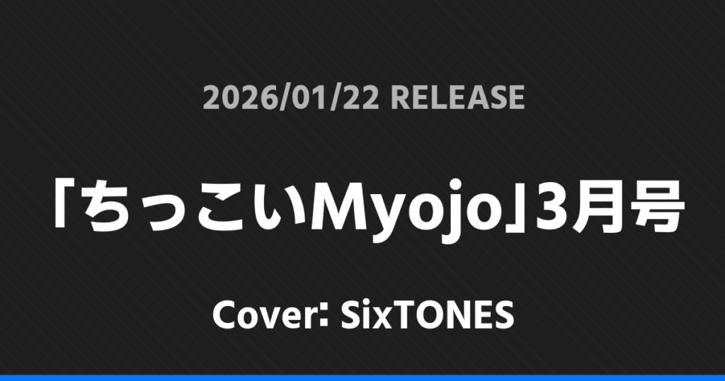 「ちっこいMyojo」3月号表紙はSixTONES! SixTONES 2026.01.162026.01.26 ※本ページにはプロモーションが含まれています。 商品リンク Amazon 楽天ブックス セブンネット タワーレコード 詳細情報 発売日:2026/01/22 表紙:SixTONES 「ちっこいMyojo」3月号の表紙はSixTONESさんです! 「Myojo」3月号表紙はSixTONES! 「美的」3月号 SPECIAL EDITION表紙は目黒蓮! ホームSixTONES