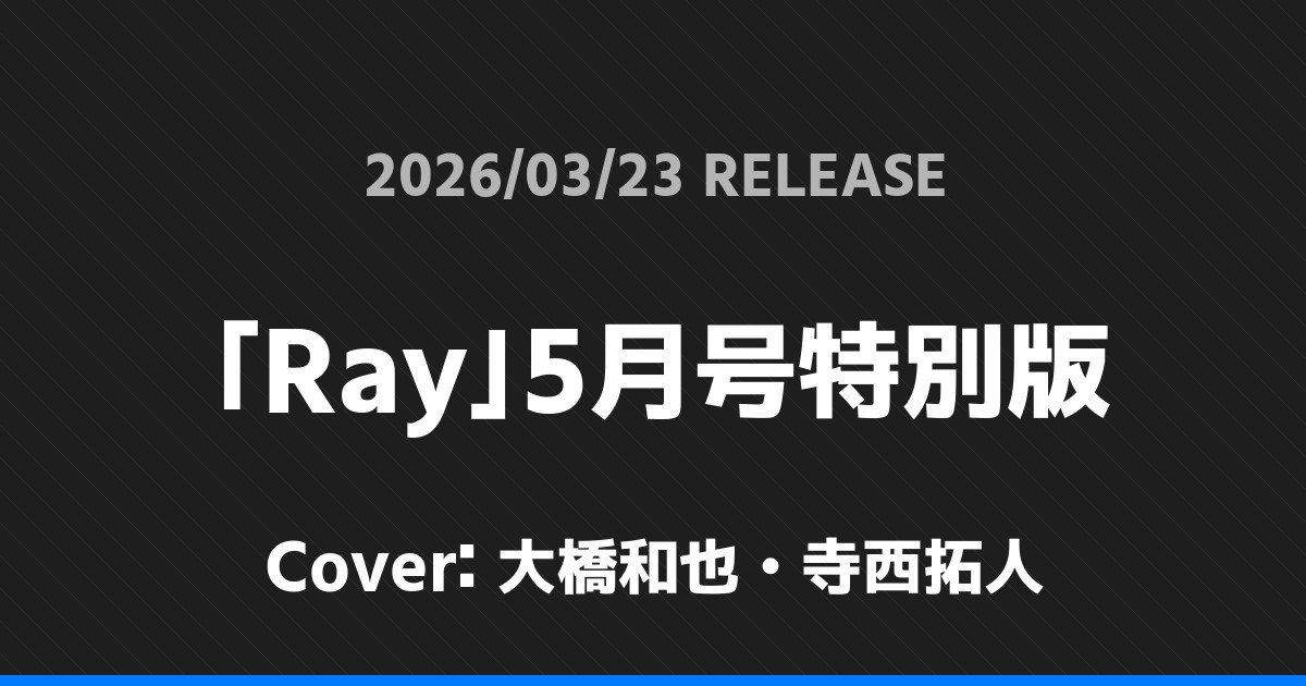 「Ray」5月号特別版表紙は大橋和也・寺西拓人! timelesz 2026.02.252026.03.23 ※本ページにはプロモーションが含まれています。 商品リンク Amazon 楽天ブックス セブンネット タワーレコード 詳細情報 発売日:2026/03/23 表紙:大橋和也・寺西拓人 「Ray」5月号特別版の表紙は大橋和也・寺西拓人さんです! スポンサーリンク 「STAGE navi」Vol.109表紙は岩本照・松田元太! 「TVガイドPERSON」vol.163表紙は増田貴久! ホームtimelesz