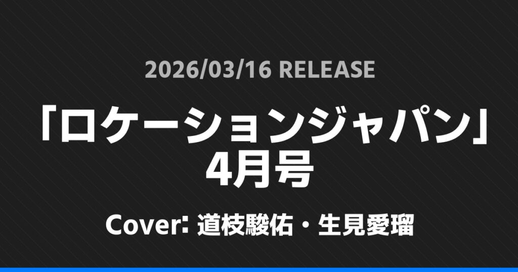 「ロケーションジャパン」4月号表紙は道枝駿佑・生見愛瑠! なにわ男子 2026.02.172026.03.16 ※本ページにはプロモーションが含まれています。 商品リンク Amazon 楽天ブックス セブンネット タワーレコード 詳細情報 発売日:2026/03/16 表紙:道枝駿佑・生見愛瑠 「ロケーションジャパン」4月号の表紙は道枝駿佑・生見愛瑠さんです! スポンサーリンク 「FREECELL」vol.73表紙は永瀬廉・吉川愛! 「美ST」5月号増刊 SPECIAL EDITION表紙は永瀬廉! ホームなにわ男子