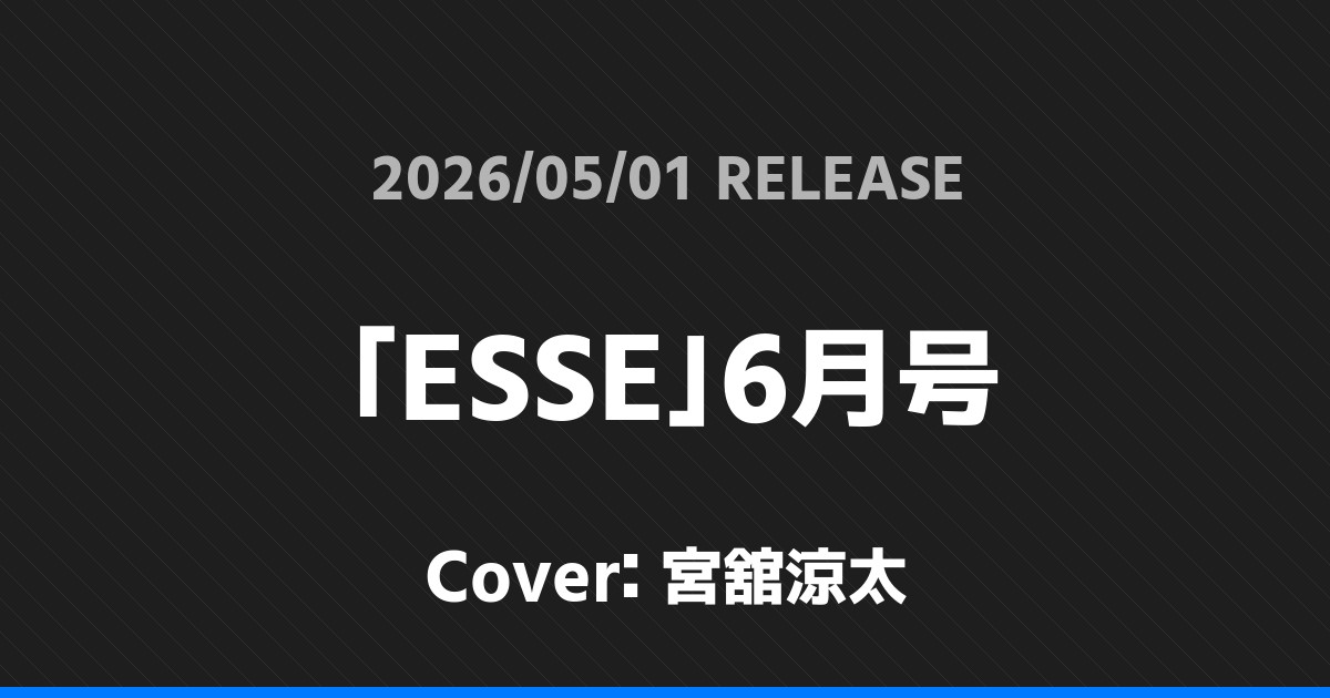 「ESSE」6月号表紙は宮舘涼太! Snow Man 2026.04.01 ※本ページにはプロモーションが含まれています。 商品リンク Amazon 楽天ブックス セブンネット タワーレコード 詳細情報 発売日:2026/05/01 表紙:宮舘涼太 「ESSE」6月号の表紙は宮舘涼太さんです! スポンサーリンク 「AERA」5/4-11合併号表紙は原嘉孝・橋本将生! ホームSnow Man