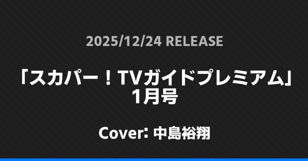 「スカパー!TVガイドプレミアム」1月号表紙は中島裕翔! 無所属 2026.01.24 ※本ページにはプロモーションが含まれています。 商品リンク Amazon 楽天ブックス セブンネット タワーレコード 詳細情報 発売日:2025/12/24 表紙:中島裕翔 「スカパー!TVガイドプレミアム」1月号の表紙は中島裕翔さんです! 「週刊少年サンデー」4-5合併号表紙は京本大我! 「+act.」2月号表紙は木村拓哉! ホーム無所属