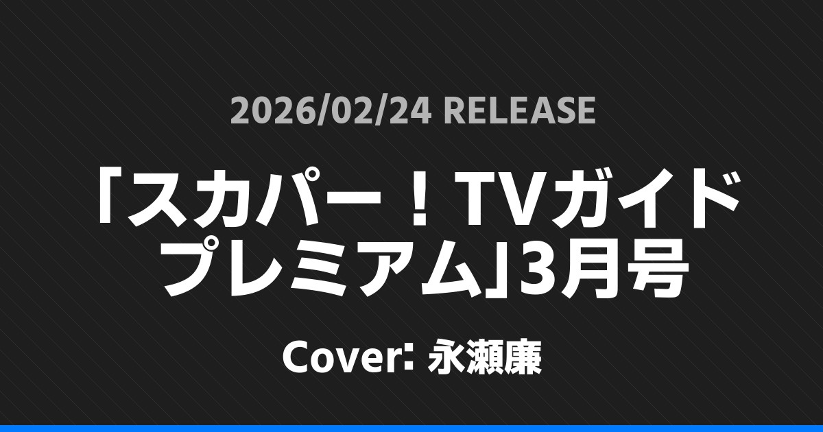 「スカパー!TVガイド プレミアム」3月号表紙は永瀬廉! King & Prince 2026.02.052026.02.06 ※本ページにはプロモーションが含まれています。 商品リンク Amazon 楽天ブックス セブンネット タワーレコード 詳細情報 発売日:2026/02/24 表紙:永瀬廉 「スカパー!TVガイド プレミアム」3月号の表紙は永瀬廉さんです! 「スカパー!TVガイドBS+CS」3月号表紙は大西流星・原嘉孝! 「ダ・ヴィンチ」4月号表紙は道枝駿佑! ホームKing & Prince