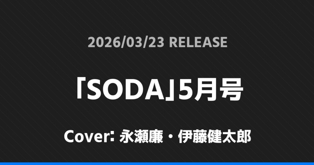 「SODA」5月号表紙は永瀬廉・伊藤健太郎! King & Prince 2026.02.242026.03.23 ※本ページにはプロモーションが含まれています。 商品リンク Amazon 楽天ブックス セブンネット タワーレコード 詳細情報 発売日:2026/03/23 表紙:永瀬廉・伊藤健太郎 「SODA」5月号の表紙は永瀬廉・伊藤健太郎さんです! /📢表紙解禁📖3月23日発売『#SODA 5月号』\表紙&巻頭特集には#永瀬廉 さん #伊藤健太郎 さんが登場✨ その他ラインナップは下記ご確認ください🌼【ピンナップ※誌面限定】永瀬廉×伊藤健太郎#中村嶺亜(#KEYTOLIT)【グラビア&インタビュー】永瀬廉×伊藤健太郎中村嶺亜(KEY TO… pic.twitter.com/wFiqYR2GyI— SODA編集部 (@pia_soda) March 17, 2026 /📢次号告知📖3月23日発売『#SODA 5月号』\表紙&巻頭特集に#永瀬廉 さん#伊藤健太郎 さんが登場✨3月27日公開の映画『#鬼の花嫁』についてあれこれ伺ってきました。紙限定のピンナップもお楽しみに😄✌️【BOOKぴあ】https://t.co/12VpE5cSlT【Amazon】https://t.co/bHBfrcVbPx… pic.twitter.com/VsRemyJjSU— SODA編集部 (@pia_soda) February 24, 2026 スポンサーリンク 「GIANNABOYFRIEND」#11 SPECIAL EDITION版表紙は七五三掛龍也! 「淡路島Walker2026‐27」表紙は西村拓哉! ホームKing & Prince