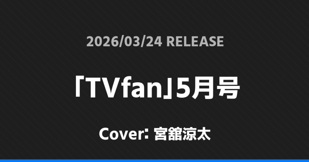 「TVfan」5月号表紙は宮舘涼太! Snow Man 2026.03.032026.03.24 ※本ページにはプロモーションが含まれています。 商品リンク Amazon 楽天ブックス セブンネット タワーレコード 詳細情報 発売日:2026/03/24 表紙:宮舘涼太 「TVfan」5月号の表紙は宮舘涼太さんです! スポンサーリンク 「Stagefan」Vol.53表紙は大橋和也・寺西拓人! 「SAUNA KIITOS」vol.2表紙は岩本照・松田元太! ホームSnow Man