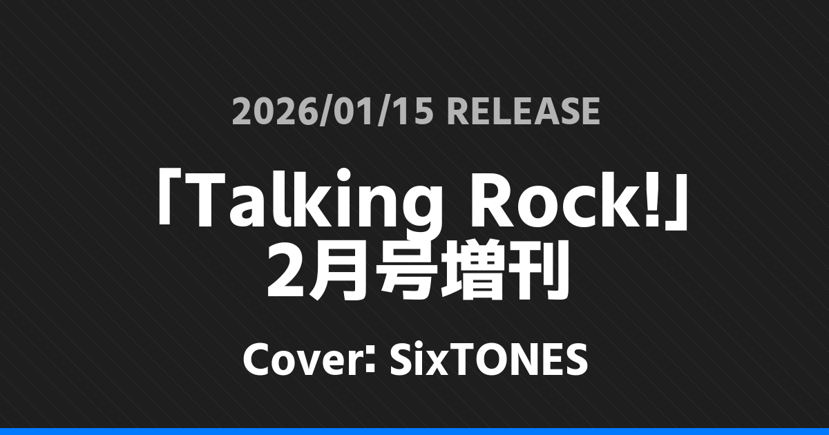 「Talking Rock!」2月号増刊表紙はSixTONES! SixTONES 2026.01.162026.01.24 ※本ページにはプロモーションが含まれています。 商品リンク Amazon 楽天ブックス セブンネット タワーレコード 詳細情報 発売日:2026/01/15 表紙:SixTONES 「Talking Rock!」2月号増刊の表紙はSixTONESさんです! 「週刊TVガイド」1/23号表紙は藤井流星・七五三掛龍也! 「QLAP!」2月号表紙は中島健人! ホームSixTONES