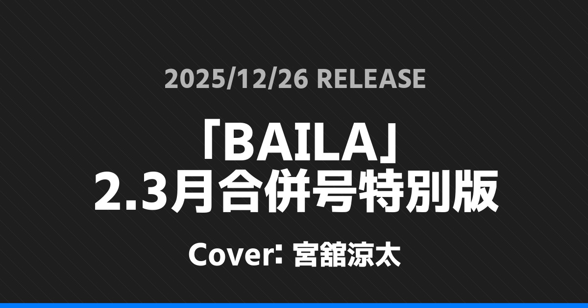 「BAILA」2.3月合併号特別版表紙は宮舘涼太! Snow Man 2026.01.24 ※本ページにはプロモーションが含まれています。 商品リンク Amazon 楽天ブックス セブンネット タワーレコード 詳細情報 発売日:2025/12/26 表紙:宮舘涼太 「BAILA」2.3月合併号特別版の表紙は宮舘涼太さんです! 「NYLON JAPAN」2月号表紙はKEY TO LIT! 「月刊スカパー」1月号表紙は寺西拓人! ホームSnow Man