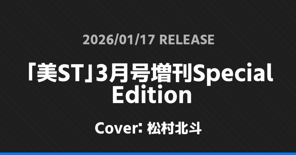 「美ST」3月号増刊Special Edition表紙は松村北斗! SixTONES 2026.01.162026.01.24 ※本ページにはプロモーションが含まれています。 商品リンク Amazon 楽天ブックス セブンネット タワーレコード 詳細情報 発売日:2026/01/17 表紙:松村北斗 「美ST」3月号増刊Special Editionの表紙は松村北斗さんです! 「QLAP!」2月号表紙は中島健人! 「TVガイドPERSON」vol.161表紙は丸山隆平! ホームSixTONES