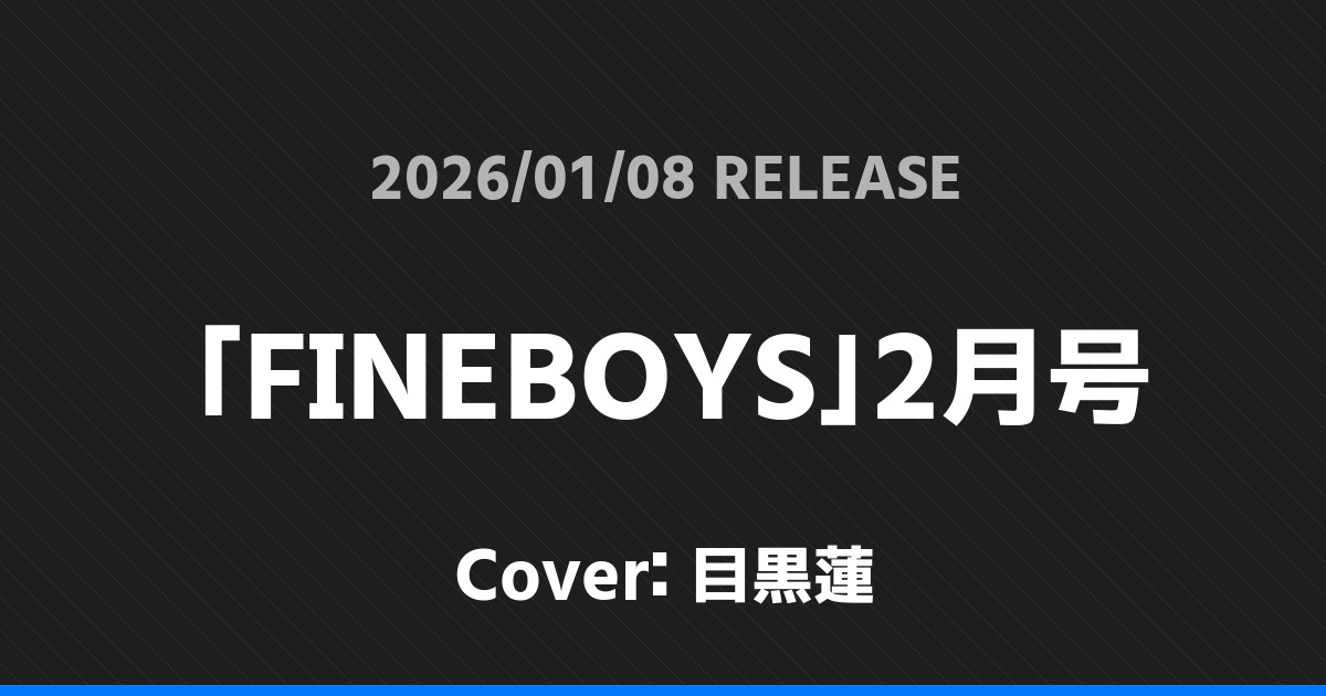 「FINEBOYS」2月号表紙は目黒蓮! Snow Man 2026.01.24 ※本ページにはプロモーションが含まれています。 商品リンク Amazon 楽天ブックス セブンネット タワーレコード 詳細情報 発売日:2026/01/08 表紙:目黒蓮 「FINEBOYS」2月号の表紙は目黒蓮さんです! 「BE-PAL」2月号表紙は井ノ原快彦! 「週刊TVガイド」1/16号表紙は菊池風磨! ホームSnow Man