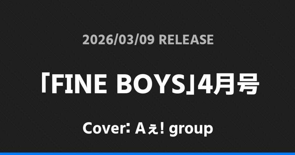「FINE BOYS」4月号表紙はAぇ! group! Aぇ! group 2026.02.162026.03.09 ※本ページにはプロモーションが含まれています。 商品リンク Amazon 楽天ブックス セブンネット タワーレコード 詳細情報 発売日:2026/03/09 表紙:Aぇ! group 「FINE BOYS」4月号の表紙はAぇ! groupさんです! FINEBOYS4月号(3/9発売)予約スタート! 表紙はAぇ! groupです!!☆日之出出版ストア☆https://t.co/YLw1Vi8NoV#Aぇǃgroup pic.twitter.com/spAg6NHmAZ— 日之出出版 (@hinode_pub) February 16, 2026 スポンサーリンク 「25ans」5月号増刊表紙は目黒蓮! 「ビッグコミック増刊」3月号表紙は目黒蓮・浜辺美波! ホームAぇ! group