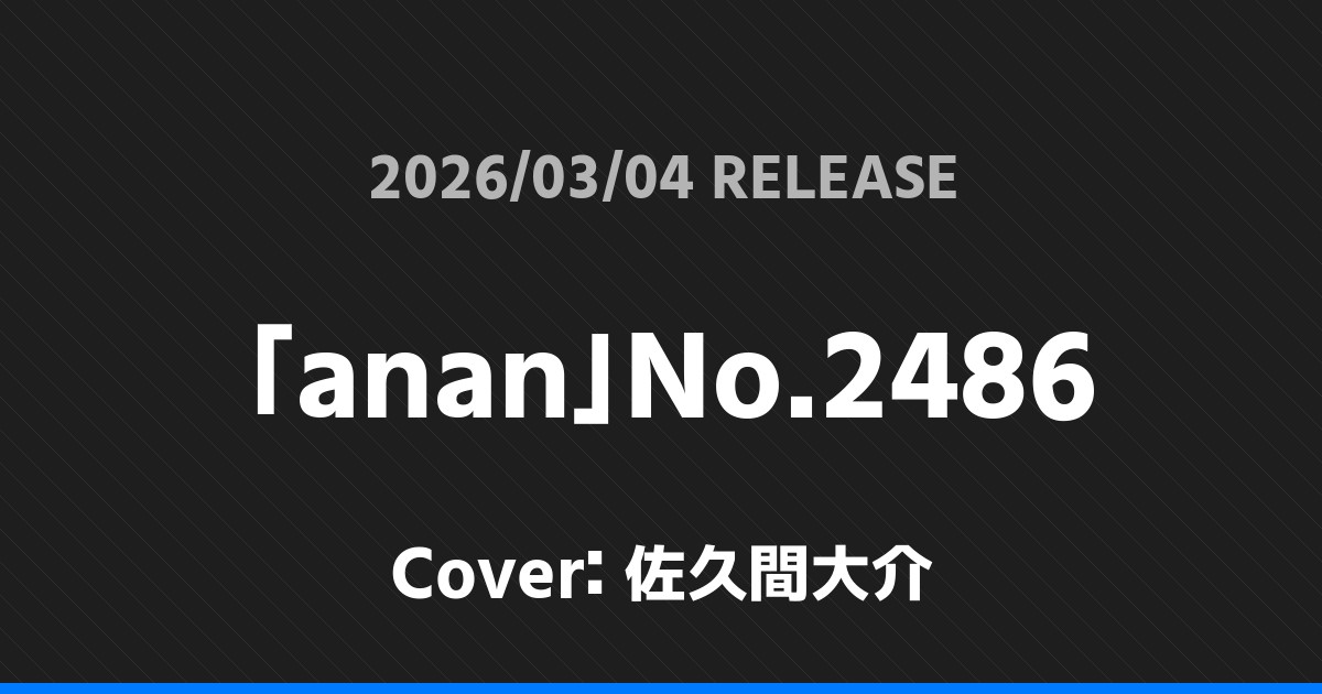 「anan」No.2486表紙は佐久間大介! Snow Man 2026.02.232026.03.03 ※本ページにはプロモーションが含まれています。 商品リンク Amazon 楽天ブックス セブンネット タワーレコード 詳細情報 発売日:2026/03/04 表紙:佐久間大介 「anan」No.2486の表紙は佐久間大介さんです! スポンサーリンク 「TV LIFE」4/3号表紙は岩本照・松田元太! 「GIANNABOYFRIEND」#11 SPECIAL EDITION版表紙は七五三掛龍也! ホームSnow Man