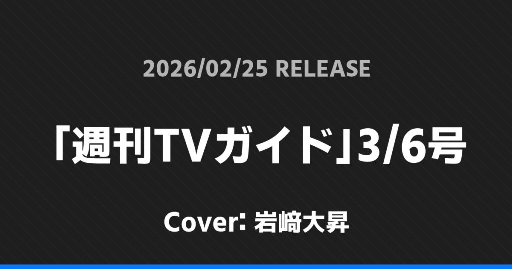 「週刊TVガイド」3/6号表紙は岩﨑大昇! ジュニア 2026.02.172026.02.26 ※本ページにはプロモーションが含まれています。 商品リンク Amazon 楽天ブックス セブンネット タワーレコード 詳細情報 発売日:2026/02/25 表紙:岩﨑大昇 「週刊TVガイド」3/6号の表紙は岩﨑大昇さんです! スポンサーリンク 「おとなのデジタルTVナビ」4月号表紙は長尾謙杜・北村一輝! 「FREECELL」vol.73表紙は永瀬廉・吉川愛! ホームジュニア