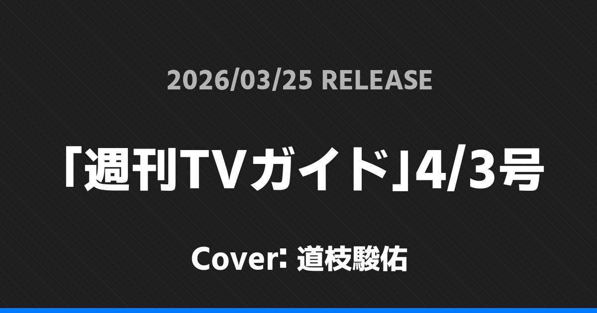 「週刊TVガイド」4/3号表紙は道枝駿佑! なにわ男子 2026.03.192026.03.25 ※本ページにはプロモーションが含まれています。 商品リンク Amazon 楽天ブックス セブンネット タワーレコード 詳細情報 発売日:2026/03/25 表紙:道枝駿佑 「週刊TVガイド」4/3号の表紙は道枝駿佑さんです! スポンサーリンク 「月刊TVnavi」5月号表紙は宮舘涼太! 「ON VOICE」Vol.3表紙は佐久間大介! ホームなにわ男子