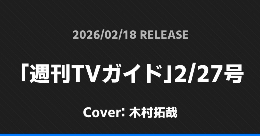 「週刊TVガイド」2/27号表紙は木村拓哉! 無所属 2026.02.132026.02.19 ※本ページにはプロモーションが含まれています。 商品リンク Amazon 楽天ブックス セブンネット タワーレコード 詳細情報 発売日:2026/02/18 表紙:木村拓哉 「週刊TVガイド」2/27号の表紙は木村拓哉さんです! \📢表紙解禁/「週刊TVガイド2026年2月27日号」2/18(水)発売表紙「教場 Requiem」👮#木村拓哉🧸「We’re timelesz LIVE TOUR 2025-2026episode 1 FAM DOME」#timelesz👦🏻「なにわ男子 1st DOME LIVE 'VoyAGE'」#なにわ男子etc.ご予約はこちら⬇️https://t.co/7jRlZpeE9q pic.twitter.com/n4pssLCvqh— 東京ニュース通信社 PR担当 (@tokyonews_pr) February 13, 2026 スポンサーリンク 「mini」5月号 ROYAL EDITION表紙は宮舘涼太! 「J Movie Magazine」Vol.128表紙は佐久間大介! ホーム無所属