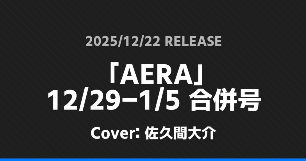 「AERA」12/29-1/5 合併号表紙は佐久間大介! Snow Man 2026.01.24 ※本ページにはプロモーションが含まれています。 商品リンク Amazon 楽天ブックス セブンネット タワーレコード 詳細情報 発売日:2025/12/22 表紙:佐久間大介 「AERA」12/29-1/5 合併号の表紙は佐久間大介さんです! 「キネマ旬報NEXT」vol.69表紙は目黒蓮・浜辺美波! 「ちっこいMyojo」2月号表紙はKEY TO LIT! ホームSnow Man