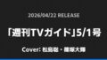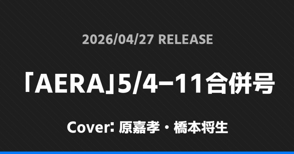 「AERA」5/4-11合併号表紙は原嘉孝・橋本将生! timelesz 2026.04.01 ※本ページにはプロモーションが含まれています。 商品リンク Amazon 楽天ブックス セブンネット タワーレコード 詳細情報 発売日:2026/04/27 表紙:原嘉孝・橋本将生 「AERA」5/4-11合併号の表紙は原嘉孝・橋本将生さんです! スポンサーリンク 「週刊TVガイド」5/1号表紙は松島聡・篠塚大輝! ホームtimelesz