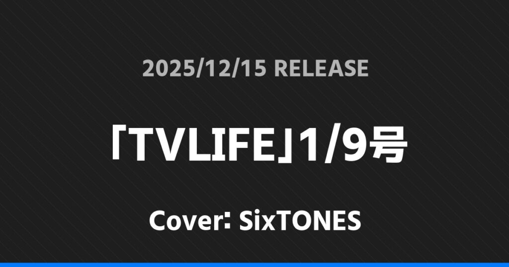 「TVLIFE」1/9号表紙はSixTONES! SixTONES 2026.01.24 ※本ページにはプロモーションが含まれています。 商品リンク Amazon 楽天ブックス セブンネット タワーレコード 詳細情報 発売日:2025/12/15 表紙:SixTONES 「TVLIFE」1/9号の表紙はSixTONESさんです! 「ザテレビジョン」お正月超特大号 2026表紙はTravis Japan! 「GIANNA17 SPECIAL EDITION版」表紙は玉森裕太! ホームSixTONES