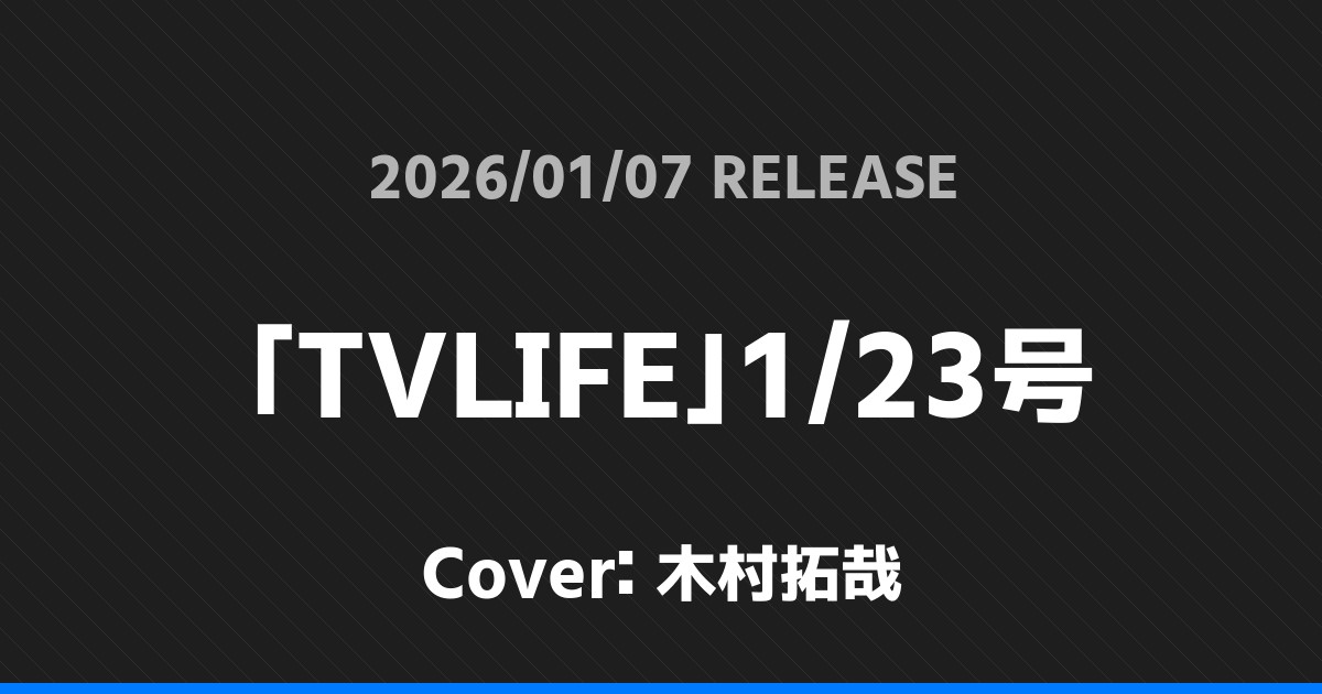 「TVLIFE」1/23号表紙は木村拓哉! 無所属 2026.01.24 ※本ページにはプロモーションが含まれています。 商品リンク Amazon 楽天ブックス セブンネット タワーレコード 詳細情報 発売日:2026/01/07 表紙:木村拓哉 「TVLIFE」1/23号の表紙は木村拓哉さんです! 「anan」No.2478表紙はSixTONES! 「ダ・ヴィンチ」2月号表紙は目黒蓮・浜辺美波! ホーム無所属