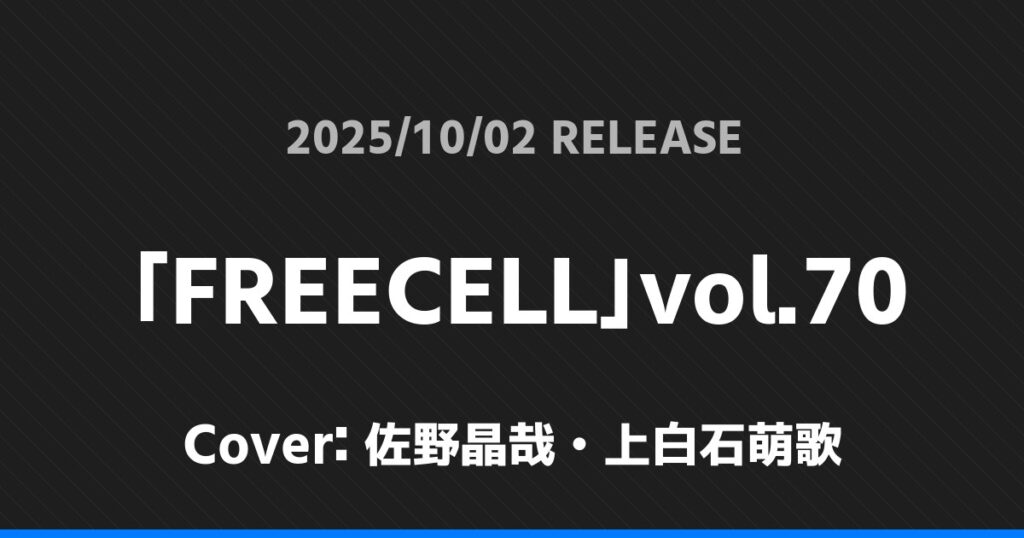「FREECELL」vol.70表紙は佐野晶哉・上白石萌歌! Aぇ! group 2026.01.24 ※本ページにはプロモーションが含まれています。 商品リンク Amazon 楽天ブックス セブンネット タワーレコード 詳細情報 発売日:2025/10/02 表紙:佐野晶哉・上白石萌歌 「FREECELL」vol.70の表紙は佐野晶哉・上白石萌歌さんです! 「CLASSY.」11月号Special Edition表紙は松村北斗! 「ESSE」11月号表紙は深澤辰哉! ホームAぇ! group