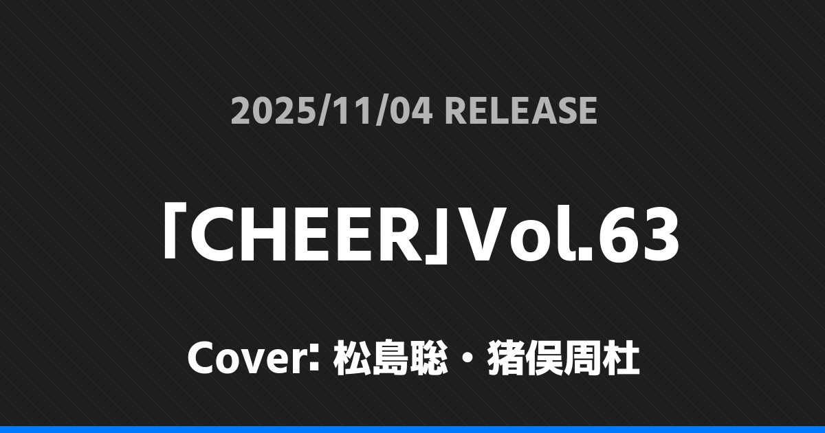 「CHEER」Vol.63表紙は松島聡・猪俣周杜! timelesz 2026.01.24 ※本ページにはプロモーションが含まれています。 商品リンク Amazon 楽天ブックス セブンネット タワーレコード 詳細情報 発売日:2025/11/04 表紙:松島聡・猪俣周杜 「CHEER」Vol.63の表紙は松島聡・猪俣周杜さんです! 「週刊TVガイド」11/14号表紙は目黒蓮・妻夫木聡! 「シネマスクエア」vol.156表紙は寺西拓人! ホームtimelesz