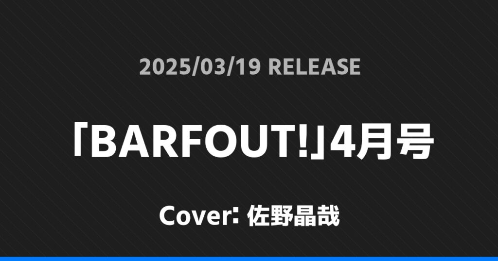「BARFOUT!」4月号表紙は佐野晶哉! Aぇ! group 2026.01.24 ※本ページにはプロモーションが含まれています。 商品リンク Amazon 楽天ブックス セブンネット タワーレコード 詳細情報 発売日:2025/03/19 表紙:佐野晶哉 「BARFOUT!」4月号の表紙は佐野晶哉さんです! 「anan」No.2439表紙はジェシー・京本大我! 「東京カレンダー2025年5月号特別増刊 大阪カレンダー」表紙は正門良規! ホームAぇ! group