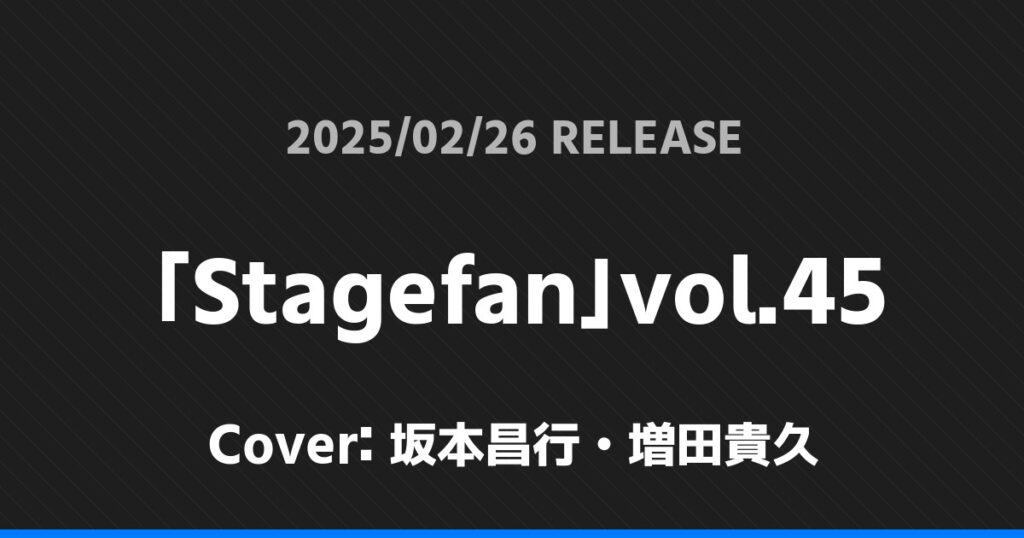「Stagefan」vol.45表紙は坂本昌行・増田貴久! 20th Century 2026.01.24 ※本ページにはプロモーションが含まれています。 商品リンク Amazon 楽天ブックス セブンネット タワーレコード 詳細情報 発売日:2025/02/26 表紙:坂本昌行・増田貴久 「Stagefan」vol.45の表紙は坂本昌行・増田貴久さんです! 「東海ウォーカー2025春」表紙は草間リチャード敬太! 「TVLIFE」3/14号表紙はAぇ! group! ホーム20th Century