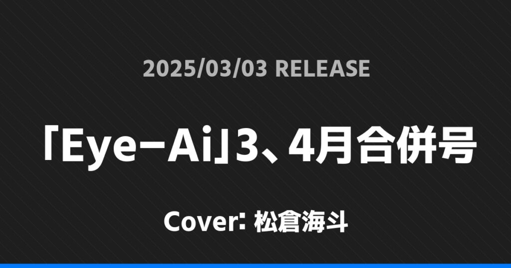 「Eye-Ai」3、4月合併号表紙は松倉海斗! Travis Japan 2026.01.24 ※本ページにはプロモーションが含まれています。 商品リンク Amazon 楽天ブックス セブンネット タワーレコード 詳細情報 発売日:2025/03/03 表紙:松倉海斗 「Eye-Ai」3、4月合併号の表紙は松倉海斗さんです! 「bis」2025年春号増刊表紙は中島健人! 「音楽と人」4月号表紙はジェシー・京本大我! ホームTravis Japan
