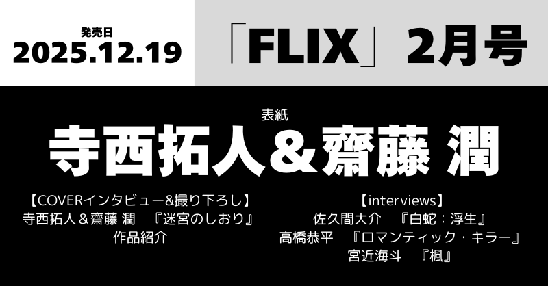 「FLIX」2月号表紙は寺西拓人・齋藤潤 timelesz 2025.11.18 ※本ページはプロモーションを含みます。 商品リンク amazon 楽天ブックス タワーレコード セブンネット 詳細 発売日:2025/12/19 表紙:寺西拓人・齋藤潤