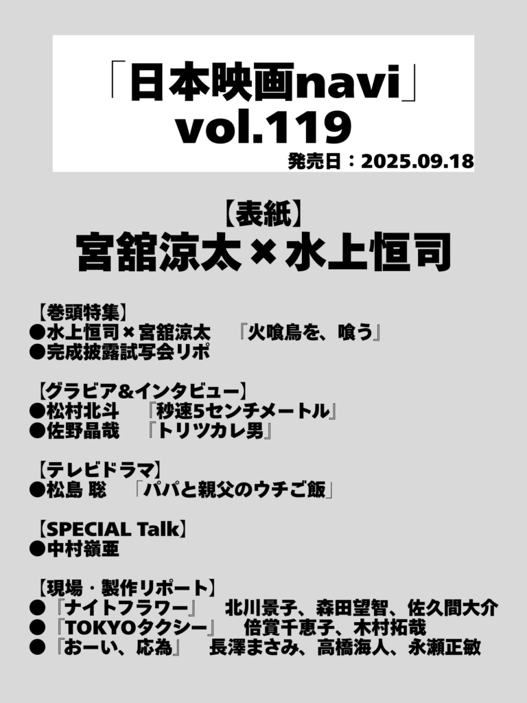 「日本映画navi」vol.119表紙は宮舘涼太・水上恒司 Snow Man 2025.09.10 ※本ページはプロモーションを含みます。 商品リンク amazon 楽天ブックス タワーレコード セブンネット 詳細 発売日:2025/09/18 表紙:宮舘涼太・水上恒司