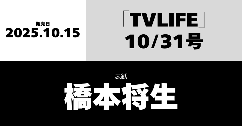 「TVLIFE」10/31号表紙は橋本将生 timelesz 2025.09.22 ※本ページはプロモーションを含みます。 商品リンク amazon 楽天ブックス タワーレコード セブンネット 詳細 発売日:2025/10/15 表紙:橋本将生