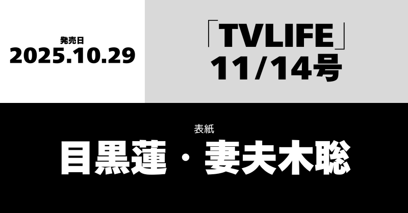 「TVLIFE」11/14号表紙は目黒蓮・妻夫木聡 Snow Man 2025.10.04 ※本ページはプロモーションを含みます。 商品リンク amazon 楽天ブックス タワーレコード セブンネット 詳細 発売日:2025/10/29 表紙:目黒蓮・妻夫木聡